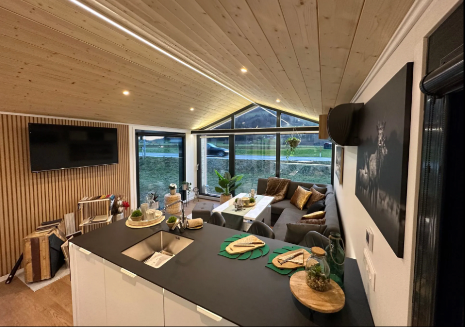 Durch die Verglasung der Giebelwand entsteht eine einzigartige Verschmelzung zwischen Mobilhome und sichtbarer Landschaft der Umgebung.